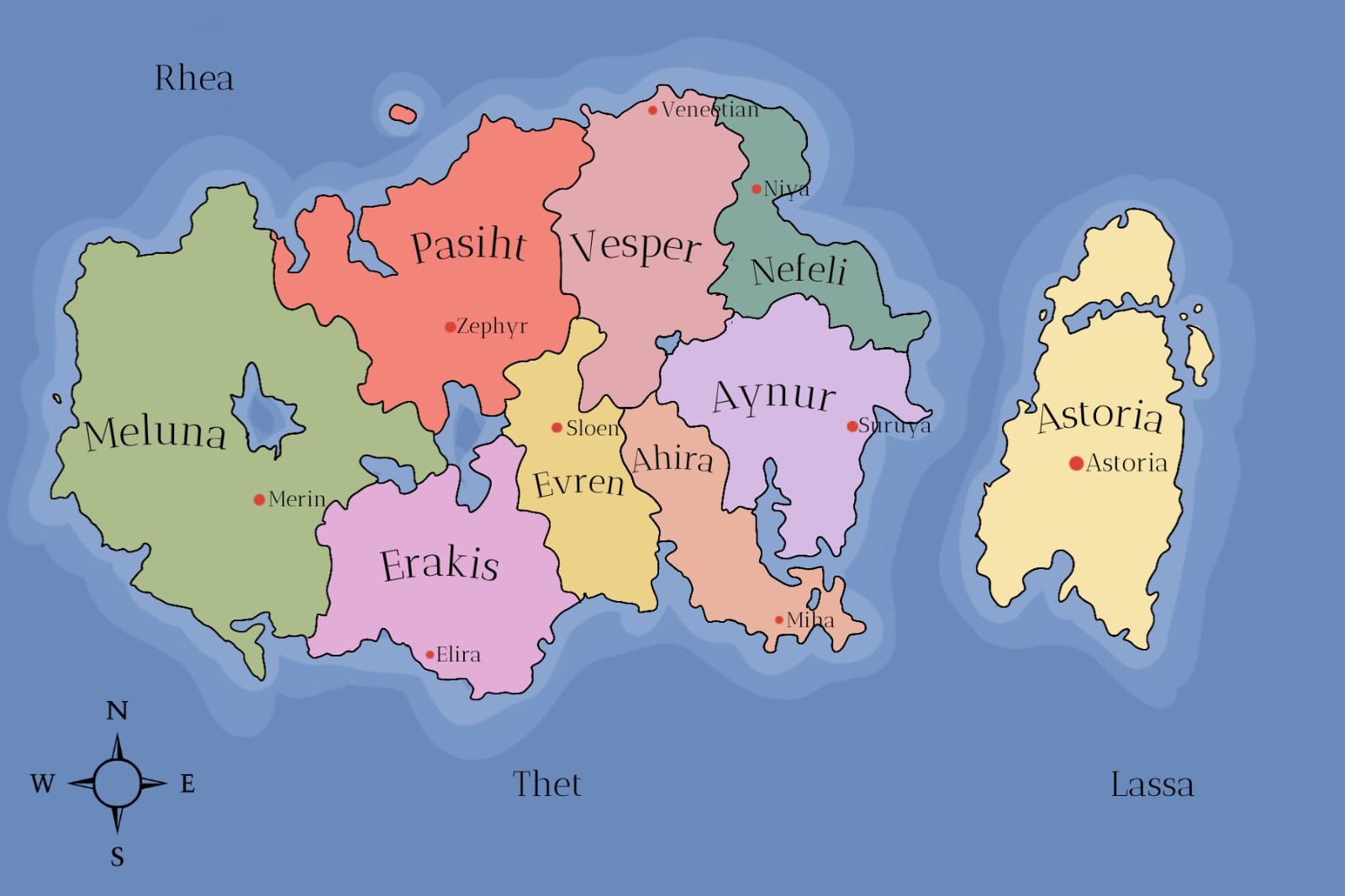 Noreth, o grande império, possui como território a totalidade do único continente conhecido, dividido em nove territórios e banhado por três oceanos de origem mitológica, Thet, Lassa e Rhea.